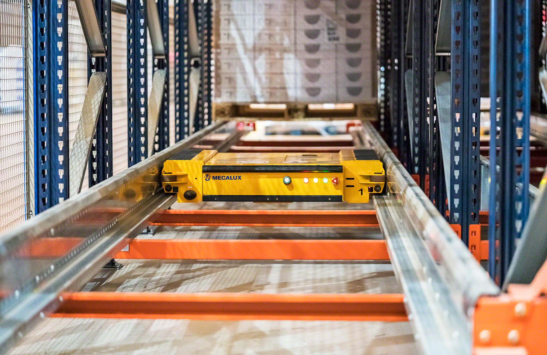 Nicméně společnost Mecalux také nabízí i plně automatizovanou alternativu: automatizované paletové kyvadlo. U tohoto řešení jsou vysokozdvižné vozíky nahrazeny zakladačem nebo soupravou překládacích vozíků, které zcela autonomně přepravují kyvadlový vozík a palety ze vstupního bodu každého skladovacího zálivu. Kromě toho jsou v případě tohoto řešení všechny operace řízeny řídicím systémem skladu (WCS).